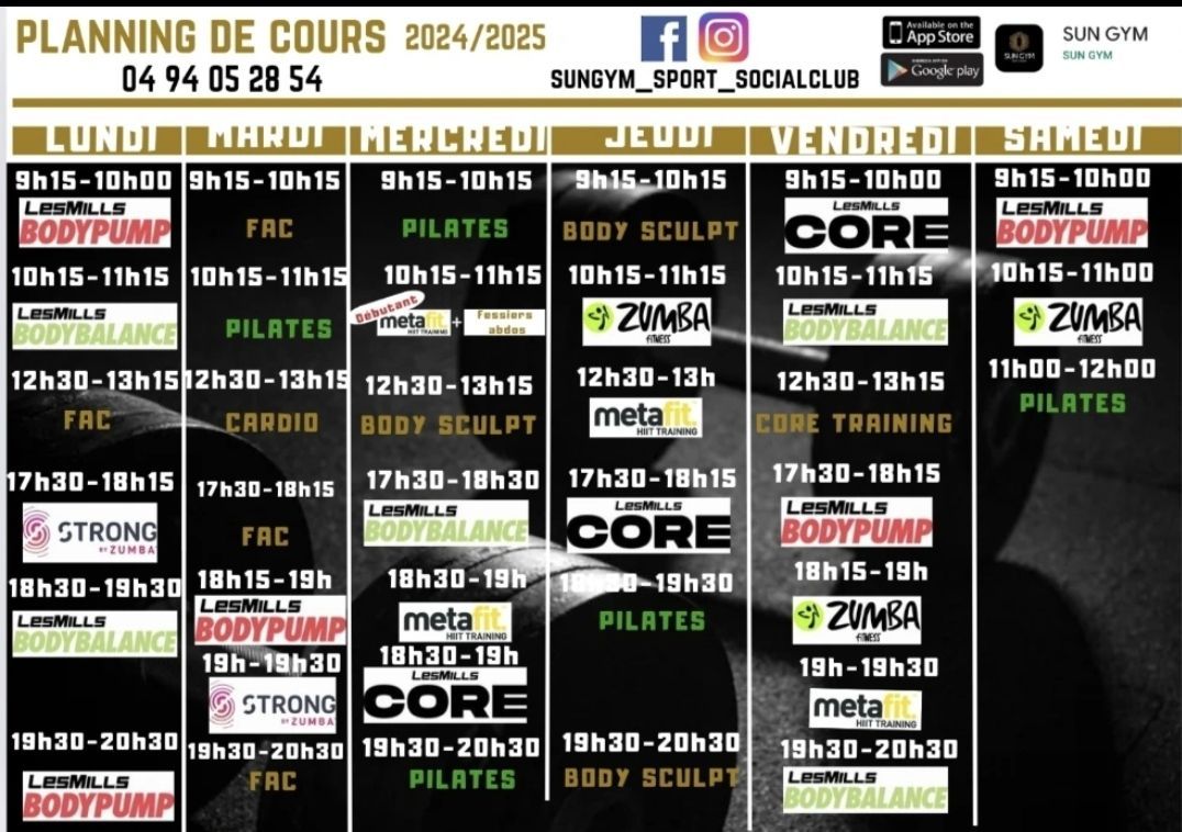Sun Gym propose sur son application des programmes personnalisés en musculation et zone fonctionnelle, des plans nutritionnel. Vous pourrez également continuer à prendre soin de vous depuis chez vous et où que vous soyez grâce à nos vidéos motivantes et inspirantes qui se trouvera en permanence sur l'onglet "planning" dans espace adhérent. (l'accès à l'application est autorisé uniquement au membre du club).