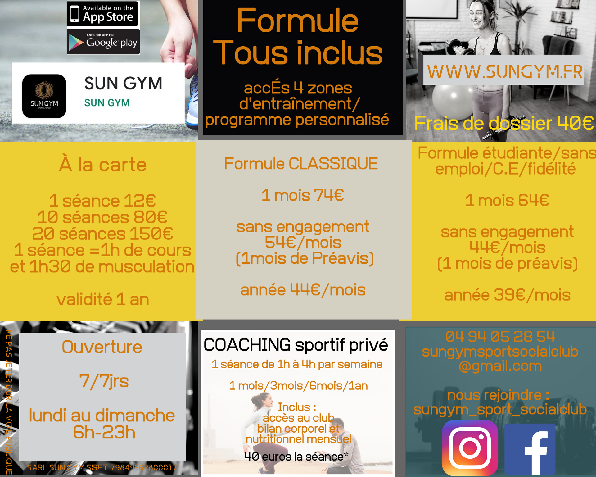 Sun Gym propose sur son application des programmes personnalisés en musculation et zone fonctionnelle, des plans nutritionnel. Vous pourrez également continuer à prendre soin de vous depuis chez vous et où que vous soyez grâce à nos vidéos motivantes et inspirantes qui se trouvera en permanence sur l'onglet "planning" dans espace adhérent. (l'accès à l'application est autorisé uniquement au membre du club).